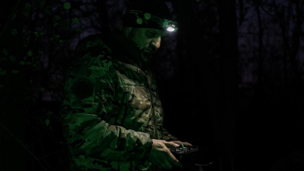 A Ukrainian pilot operates an attack drone on the Pokrovsk combat front