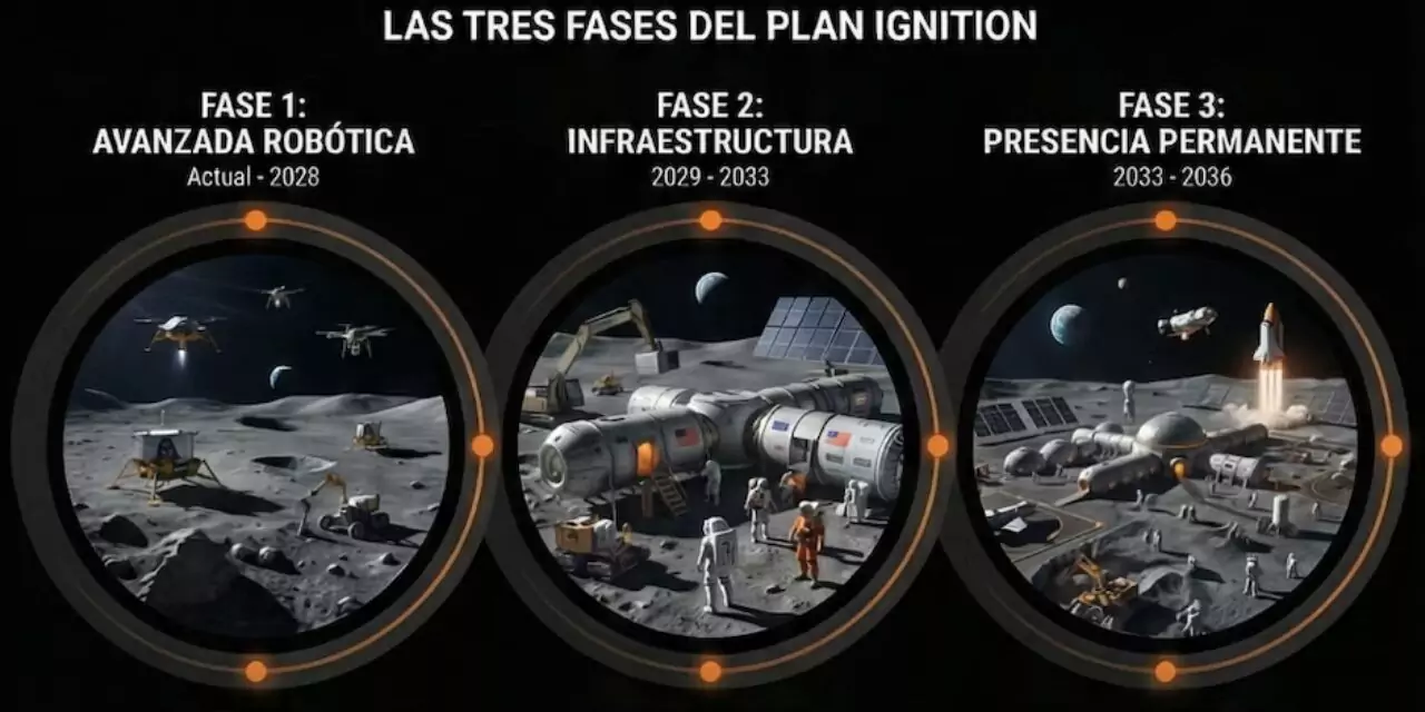The strategy is divided into three progressive stages. The first, with more than 20 landings, seeks to lay the technological and logistical foundations before 2029. The second contemplates the development of infrastructure and frequent manned missions, while the third aims at permanent occupation using resources from the Moon itself.
